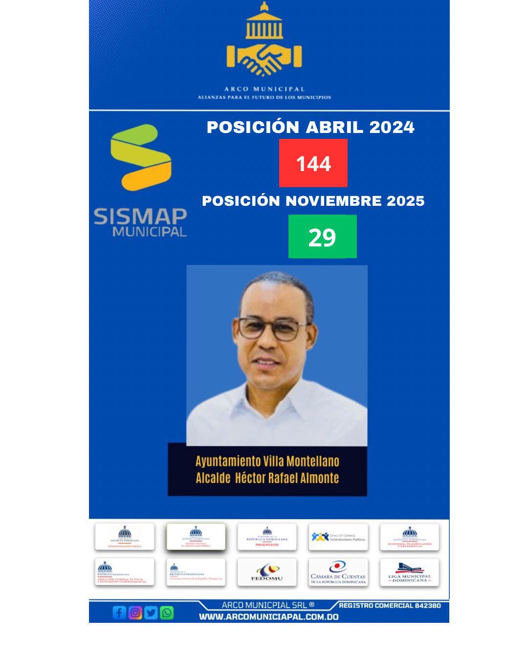 Según la más reciente evaluación del Sistema de Monitoreo de la Administración Pública (SISMAP Municipal), nuestro municipio ha alcanzado la posición número 29 a nivel nacional, reflejo del trabajo constante, la transparencia institucional y la correcta aplicación de los recursos públicos.